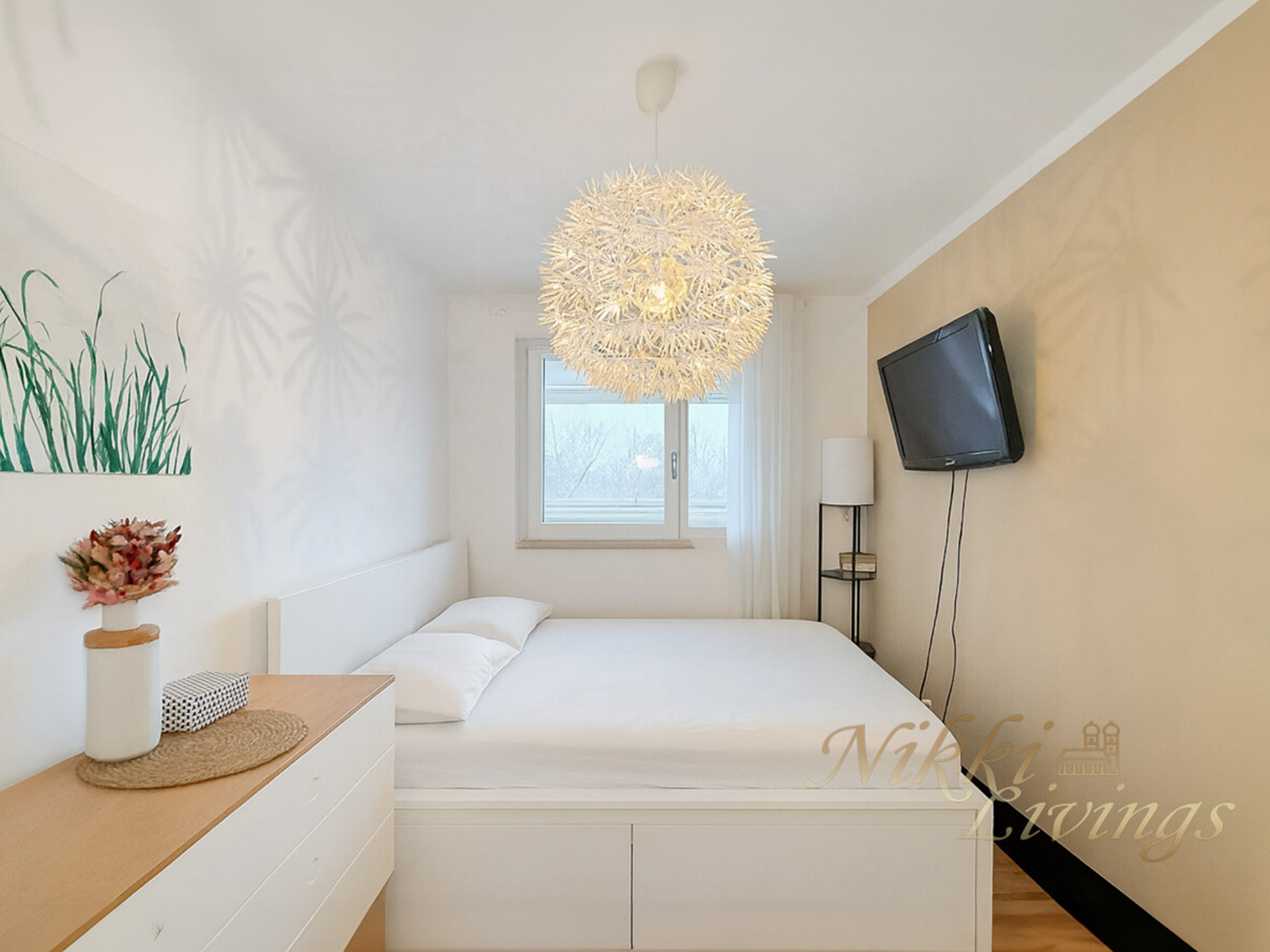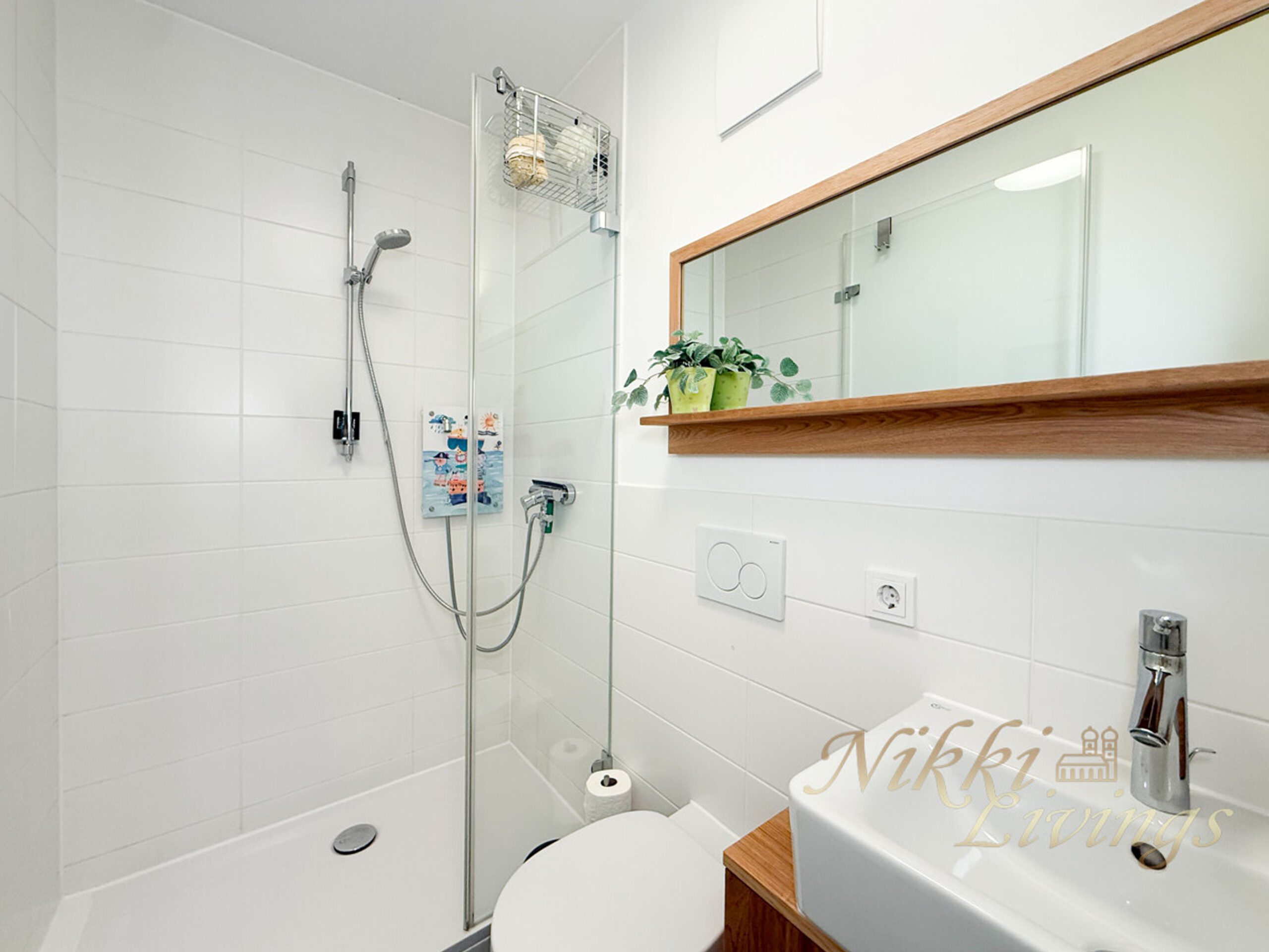 Das Schlafzimmer bietet ebenfalls Zugang zum Balkon und schafft so ein besonders harmonisches Wohnambiente. Zusätzlich stehen zwei moderne Badezimmer zur Verfügung – eines ausgestattet mit einer Dusche, das andere mit einer Badewanne.