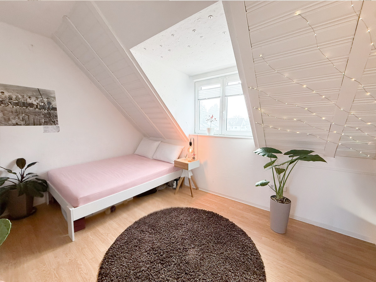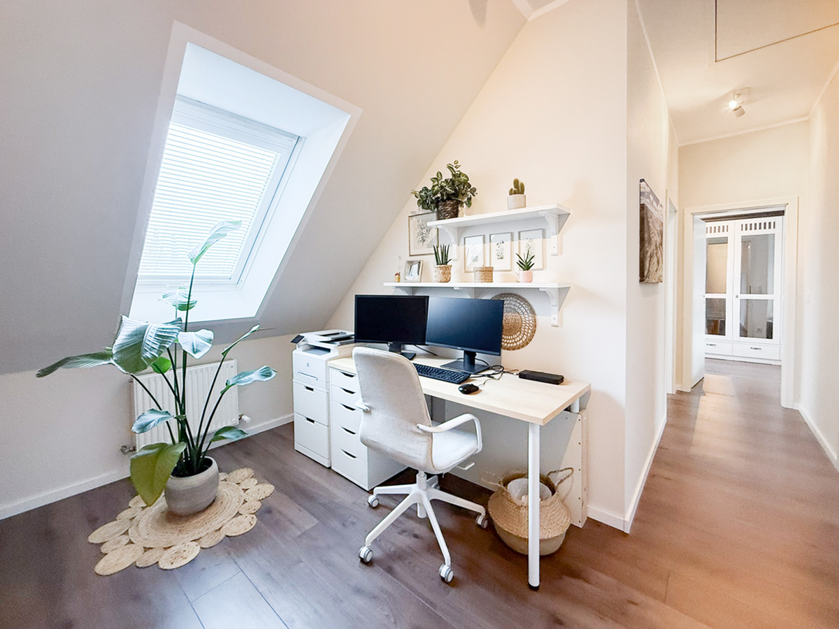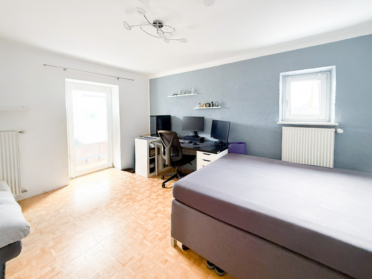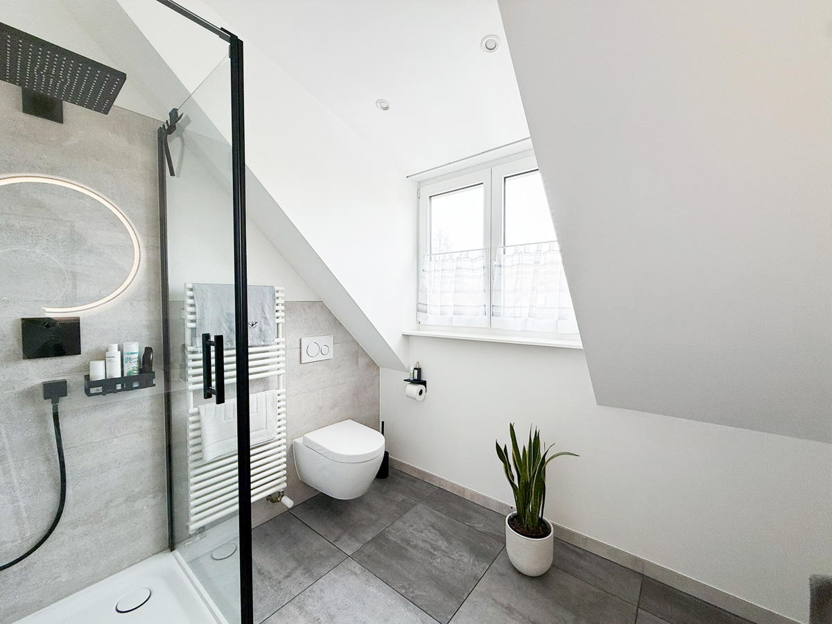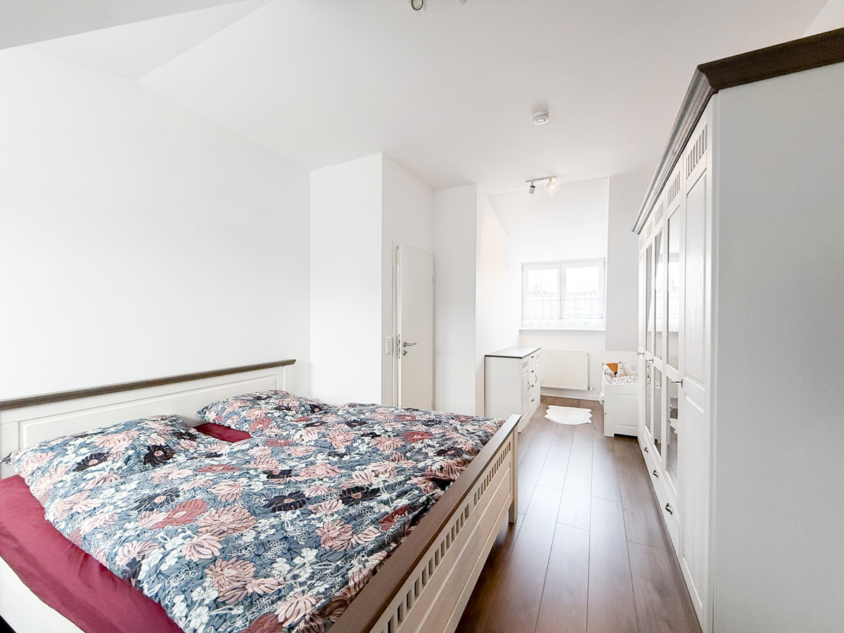 Die zweite Wohneinheit erstreckt sich über das erste Obergeschoss und das Dachgeschoss. Im ersten Stock befindet sich ein Schlafzimmer Schlafzimmer, ein Badezimmer mit Badewanne sowie eine große Küche mit gemütlicher Sitzecke. Das lichtdurchflutete Wohnzimmer besticht durch den Zugang zum Balkon mit einer Westausrichtigung. Das zugehörige Dachgeschoss bietet zusätzlichen Raum mit zwei weiteren Schlafzimmern, einem modernen Badezimmer mit Dusche und einem integrierten Arbeitsbereich – ideal für Familien mit Platzbedarf.