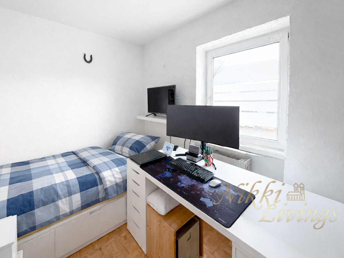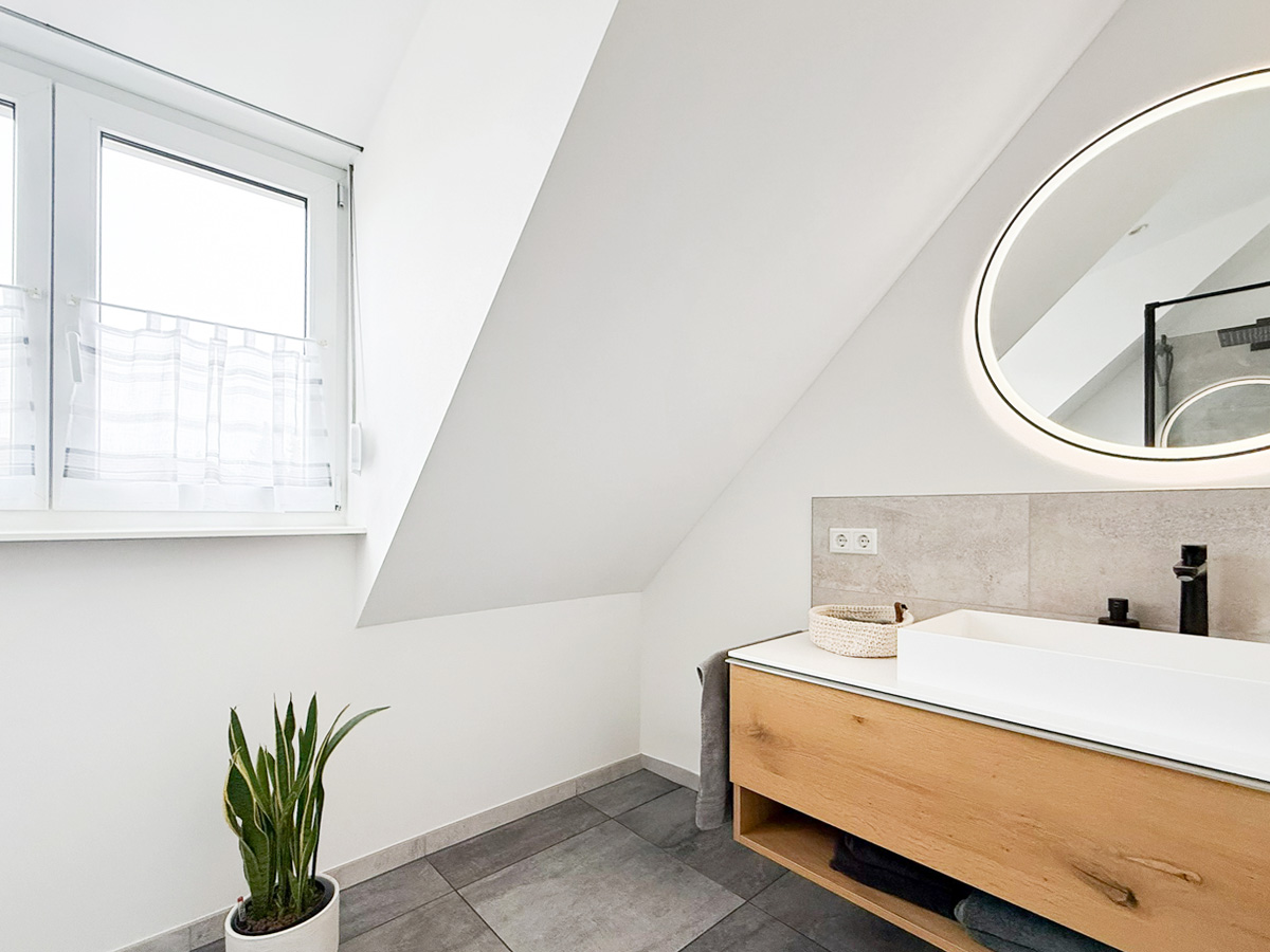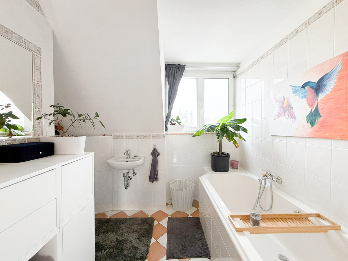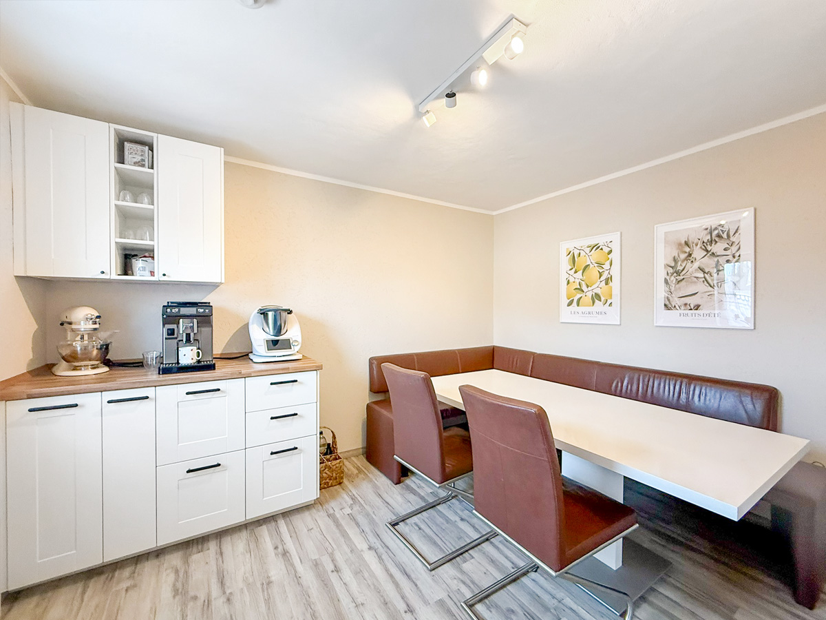 Die zweite Wohneinheit erstreckt sich über das erste Obergeschoss und das Dachgeschoss. Im ersten Stock befindet sich ein Schlafzimmer Schlafzimmer, ein Badezimmer mit Badewanne sowie eine große Küche mit gemütlicher Sitzecke. Das lichtdurchflutete Wohnzimmer besticht durch den Zugang zum Balkon mit einer Westausrichtigung. Das zugehörige Dachgeschoss bietet zusätzlichen Raum mit zwei weiteren Schlafzimmern, einem modernen Badezimmer mit Dusche und einem integrierten Arbeitsbereich – ideal für Familien mit Platzbedarf.
