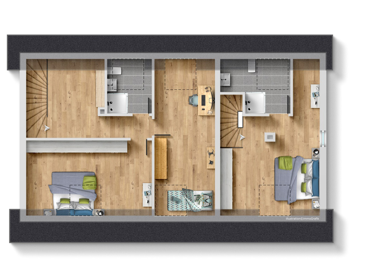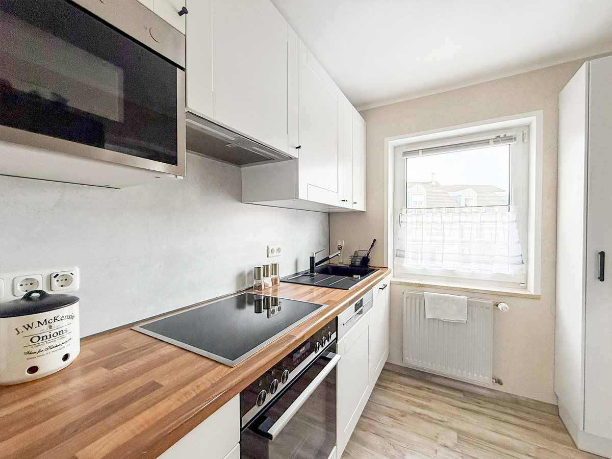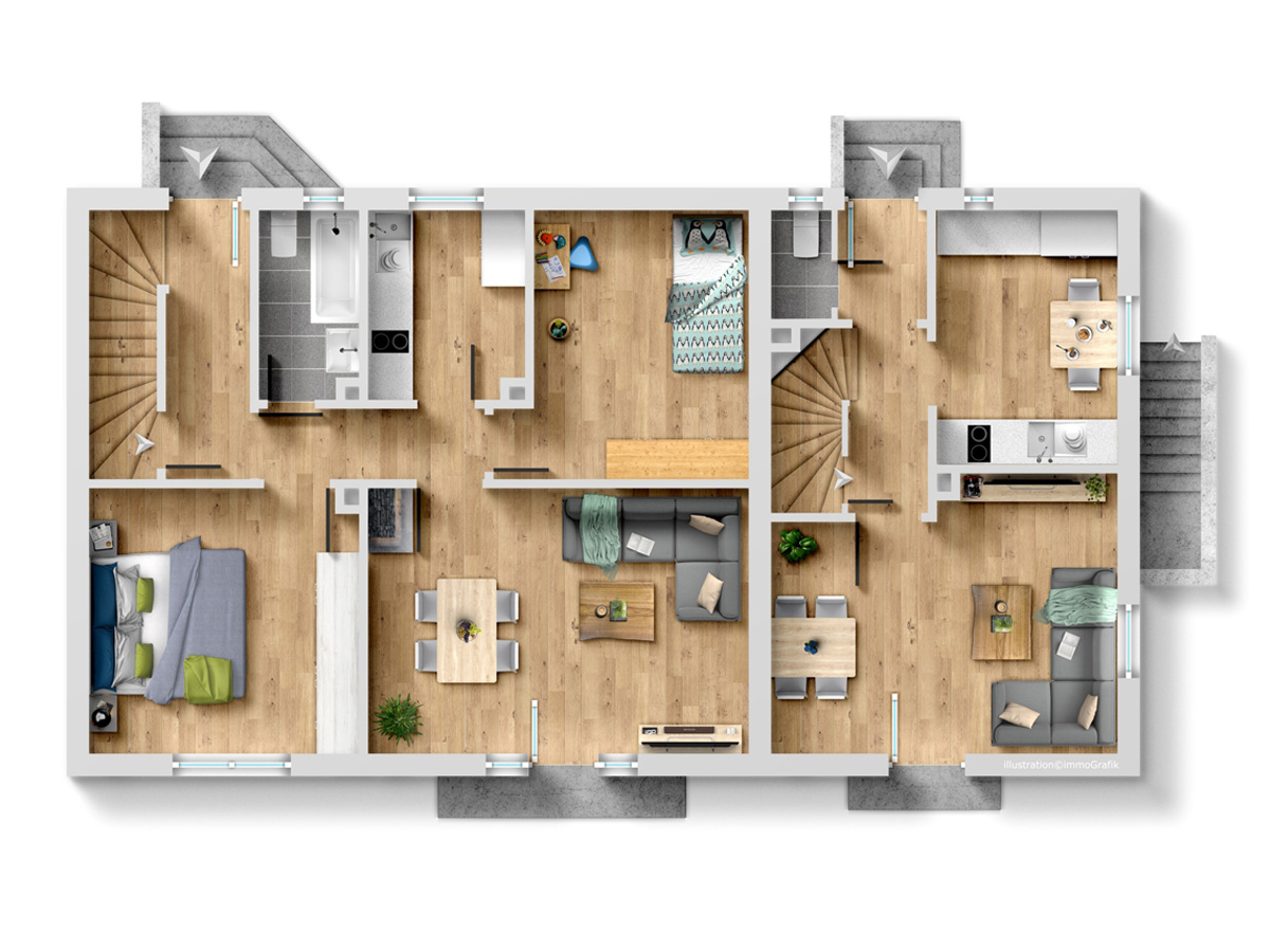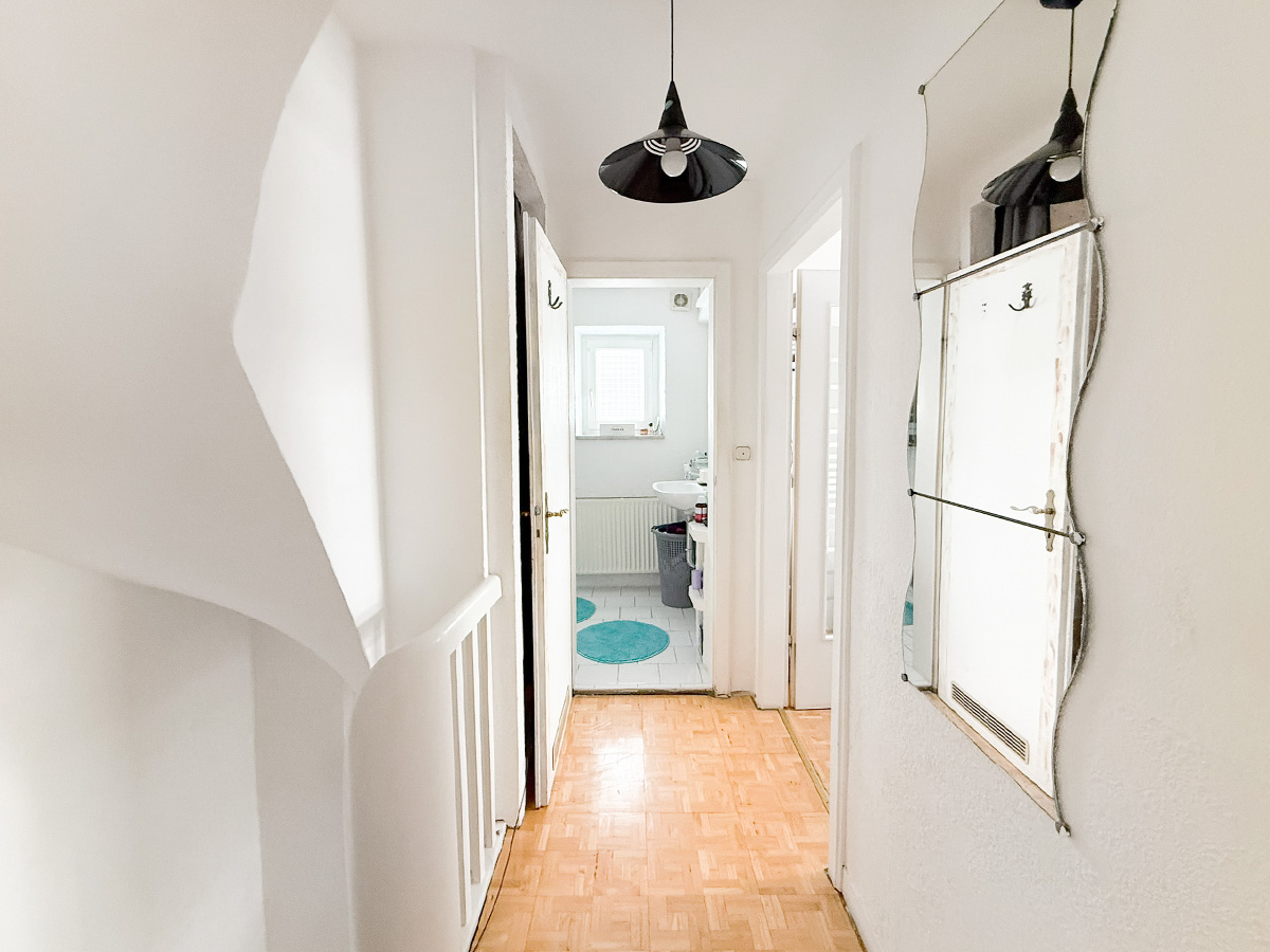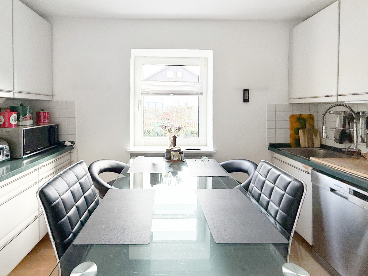 Die zweite Wohneinheit erstreckt sich über das erste Obergeschoss und das Dachgeschoss. Im ersten Stock befindet sich ein Schlafzimmer Schlafzimmer, ein Badezimmer mit Badewanne sowie eine große Küche mit gemütlicher Sitzecke. Das lichtdurchflutete Wohnzimmer besticht durch den Zugang zum Balkon mit einer Westausrichtigung. Das zugehörige Dachgeschoss bietet zusätzlichen Raum mit zwei weiteren Schlafzimmern, einem modernen Badezimmer mit Dusche und einem integrierten Arbeitsbereich – ideal für Familien mit Platzbedarf.