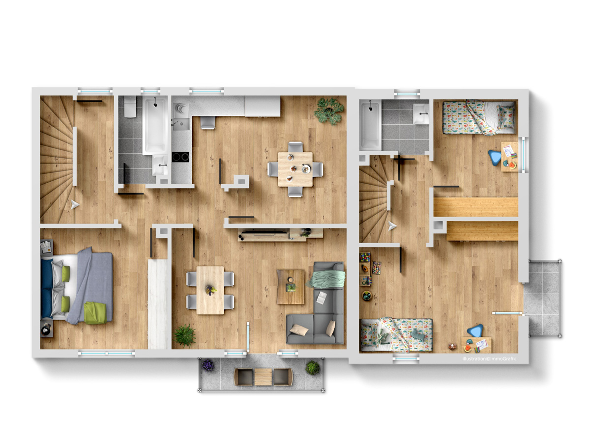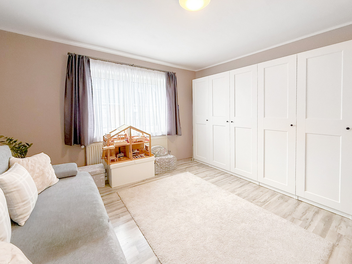 Die dritte Wohneinheit (Haus 2/Anbau) fungiert als eigenständiges Wohndomizil über drei Etagen. Im Erdgeschoss befinden sich der Eingangsbereich mit separatem WC, die Küche und ein Wohnzimmer mit direktem Zugang zum Garten. Das erste Obergeschoss bietet zwei Kinderzimmer und ein Duschbad, während das Dachgeschoss als privater Rückzugsort mit einem Schlafzimmer und einem eigenen Badezimmer inklusive Badewanne gestaltet ist.