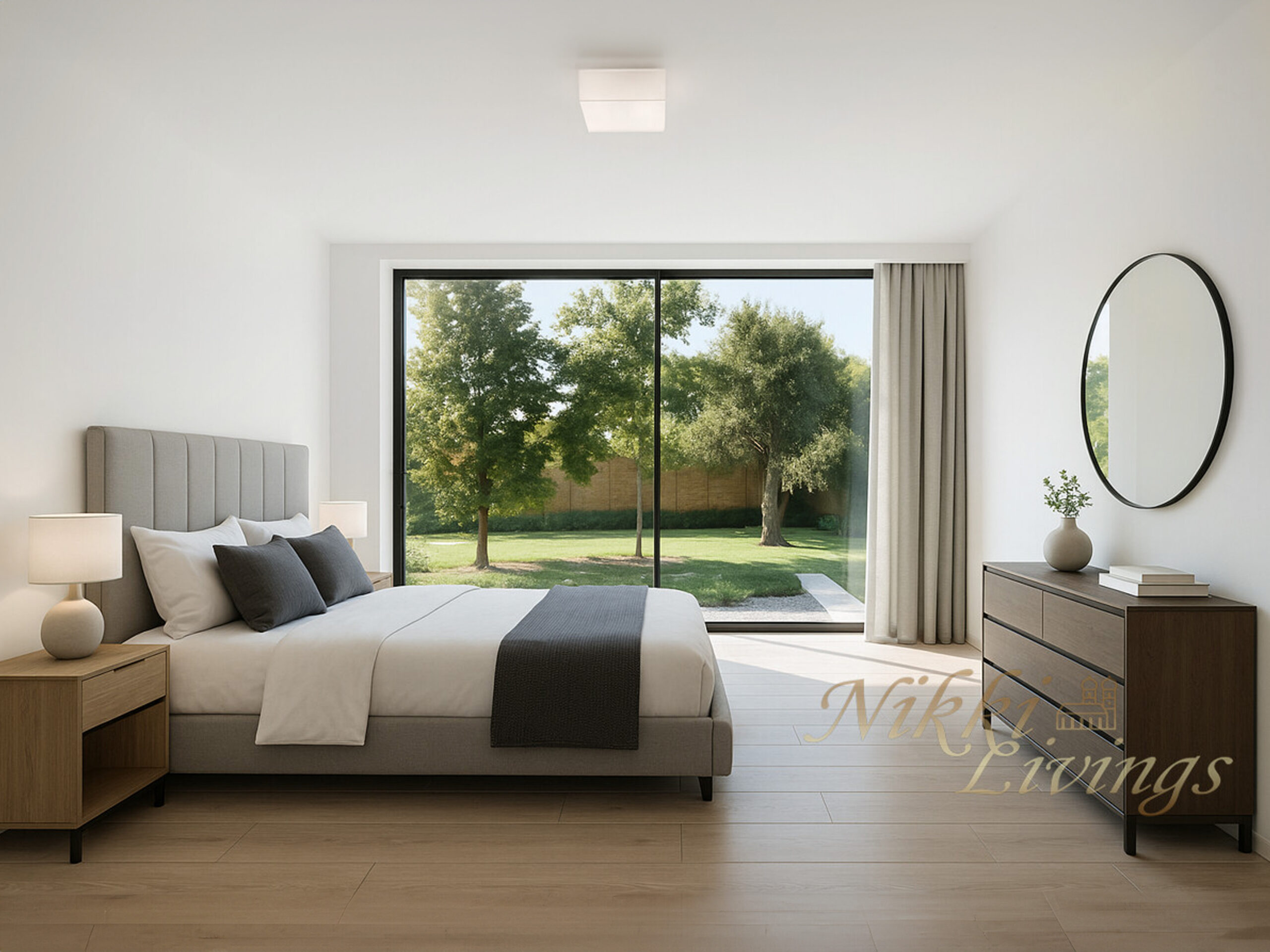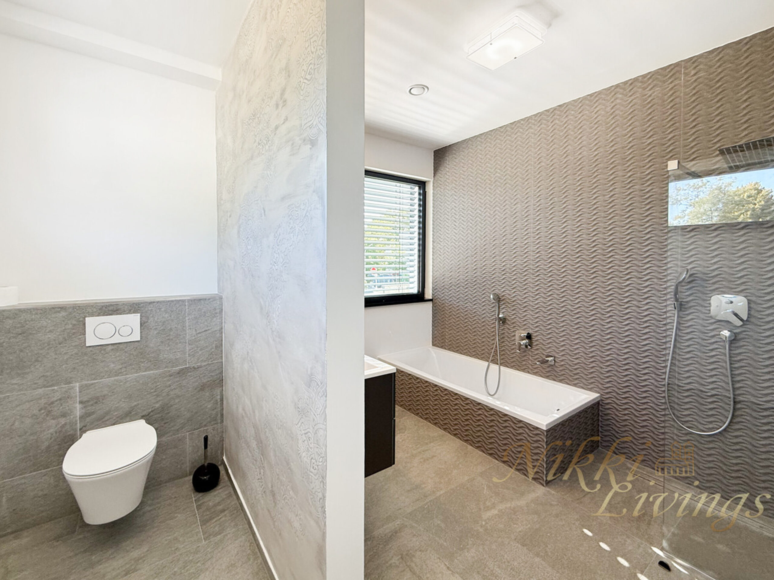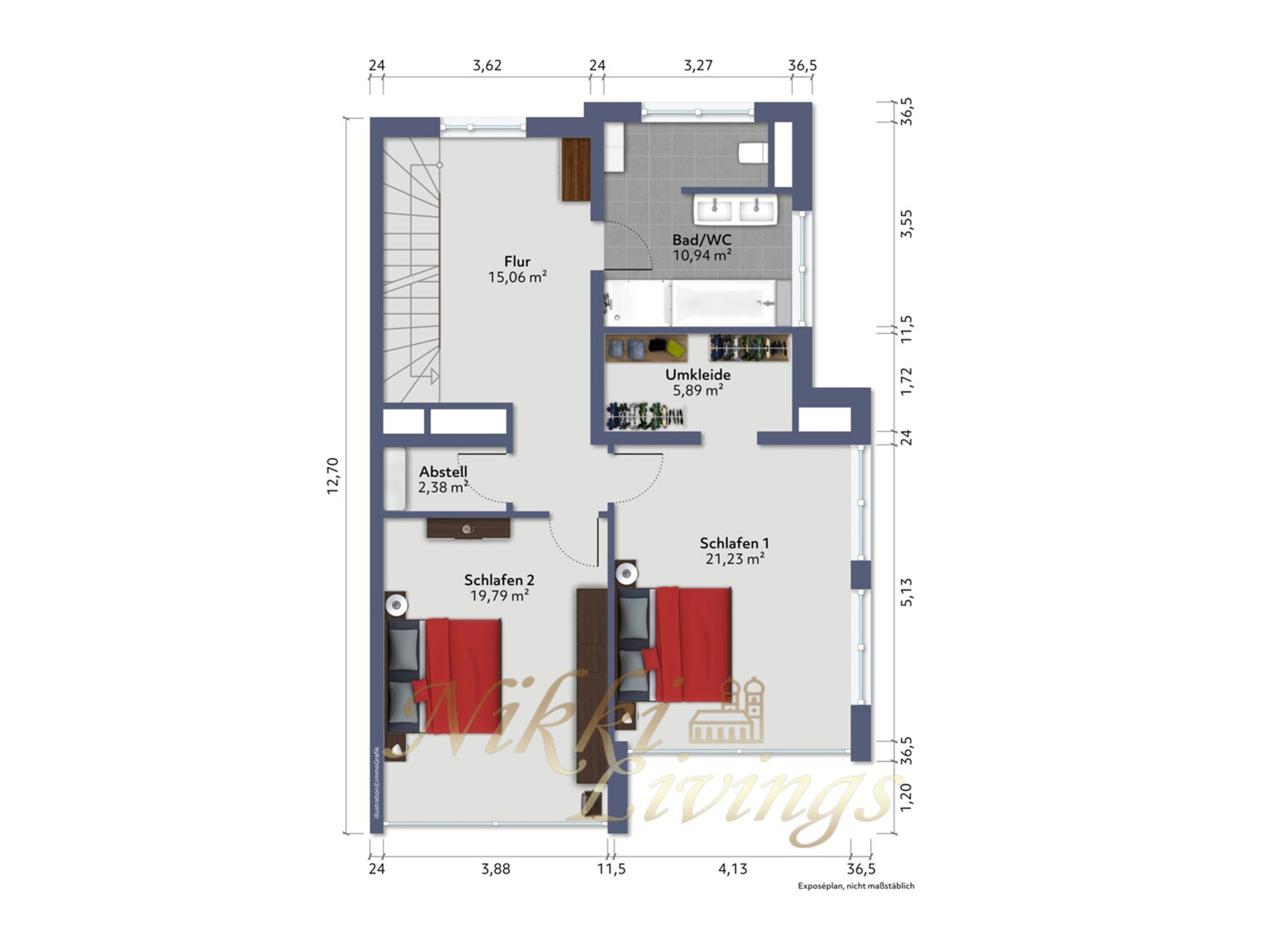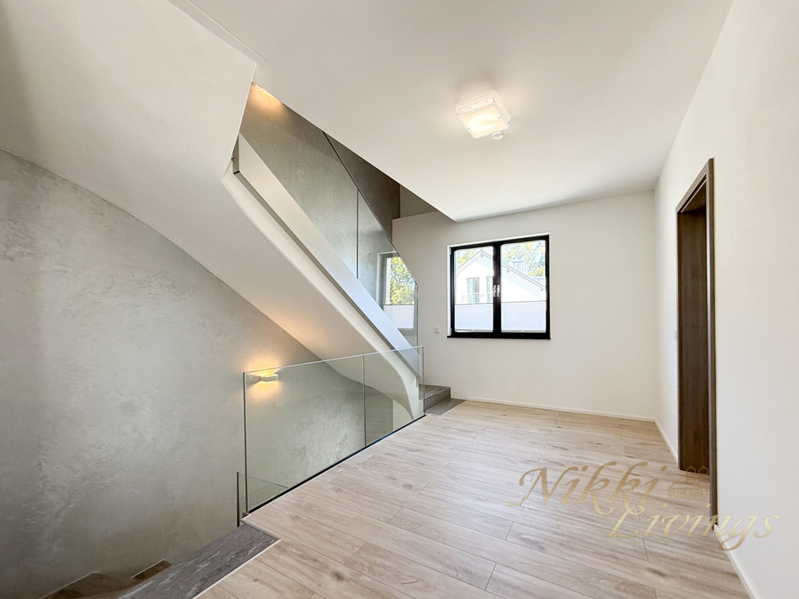 Das erste Obergeschoss besticht durch zwei große Schlafzimmer, deren hohe Decken von ca. 2,80 Metern für ein außergewöhnlich großzügiges Raumgefühl sorgen. Eines der Zimmer ist zusätzlich mit einer eleganten Ankleide ausgestattet, die den Anspruch an Komfort und Luxus unterstreicht. Ein stilvoll gestaltetes Badezimmer mit edlen Fliesen rundet diese Wohnebene ab und lädt durch seine hochwertige Ausstattung zu entspannenden Momenten ein. Ergänzt wird die Etage mit einem kleinen Raum für z.B. Haushaltsgeräte.