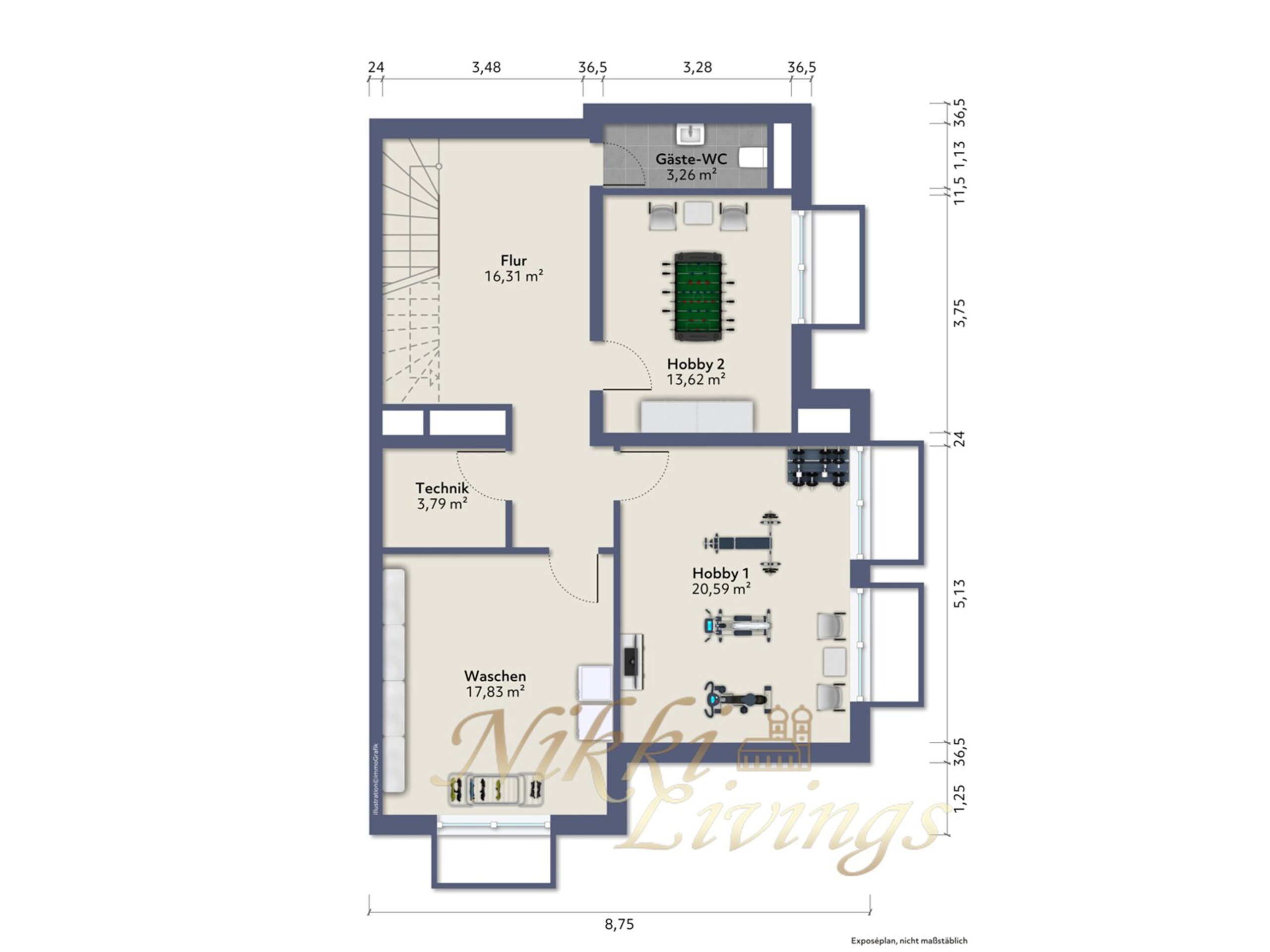 Über die Treppe beim Eingang erreicht man das Untergeschoss, das mit seiner durchdachten Raumaufteilung überzeugt. Hier stehen ein weiteres WC, ein Technikraum, ein Waschraum sowie zwei vielseitig nutzbare Hobbyräume zur Verfügung – ideal für Fitnessgeräte, ein Heimkino oder auch als Rückzugsort.