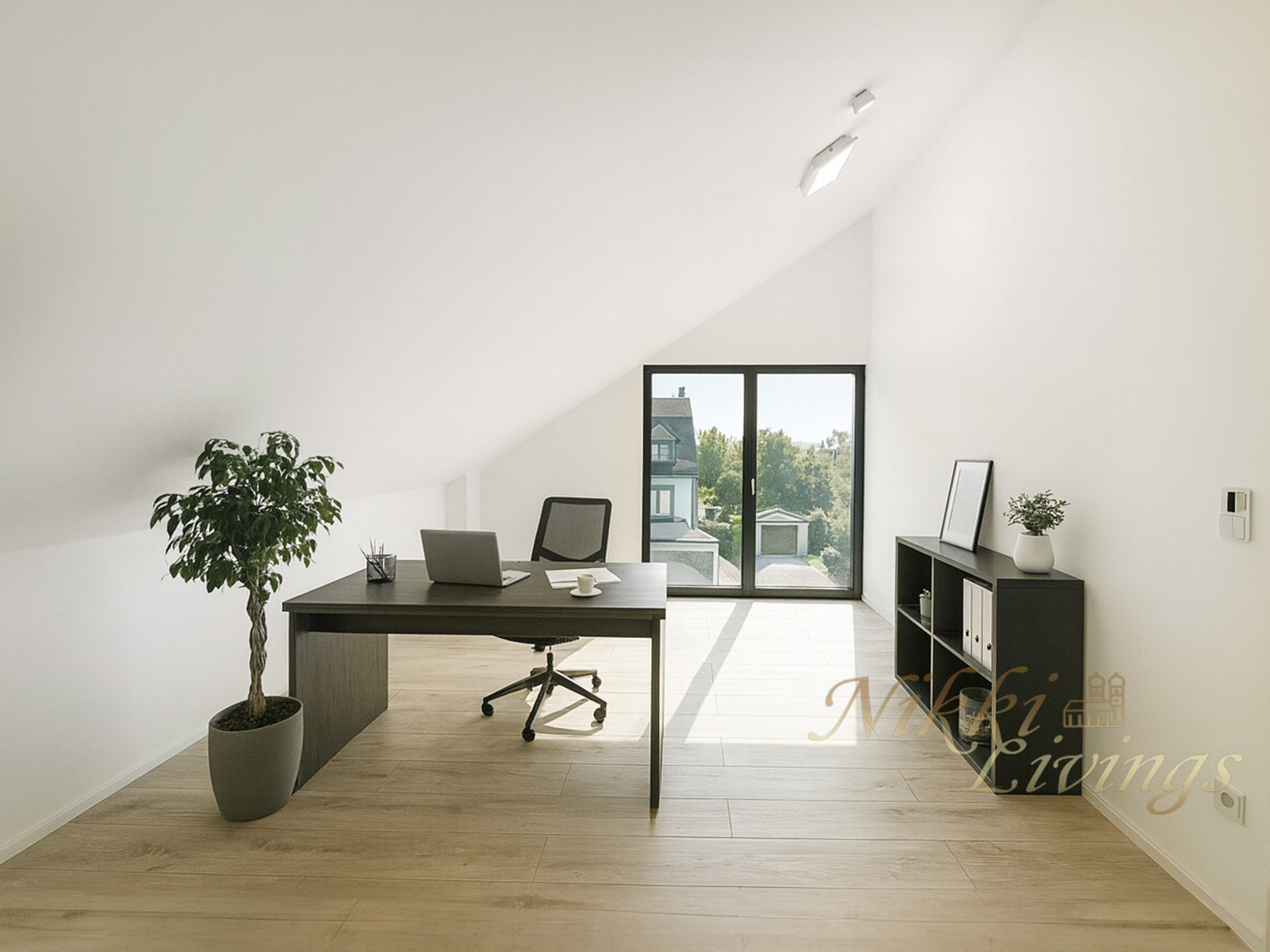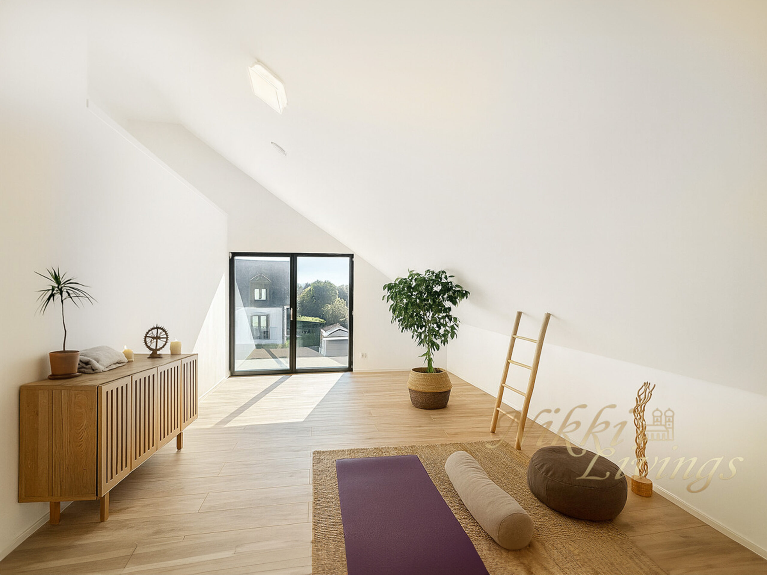 Im Dachgeschoss eröffnet sich rechts von der Treppe ein gemütliches Zimmer, das vielfältig genutzt werden kann. Geradeaus liegt ein weiteres Bad mit WC, und dahinter befindet sich eine zusätzliche Wohneinheit, die individuell als Gästebereich, Büro oder weiteres Schlafzimmer gestaltet werden kann. Vom Studio aus gelangt man auf die großzügige Dachterrasse, die sich rund um den Raum erstreckt und einen einzigartigen Blick über das gesamte Grundstück bietet.
