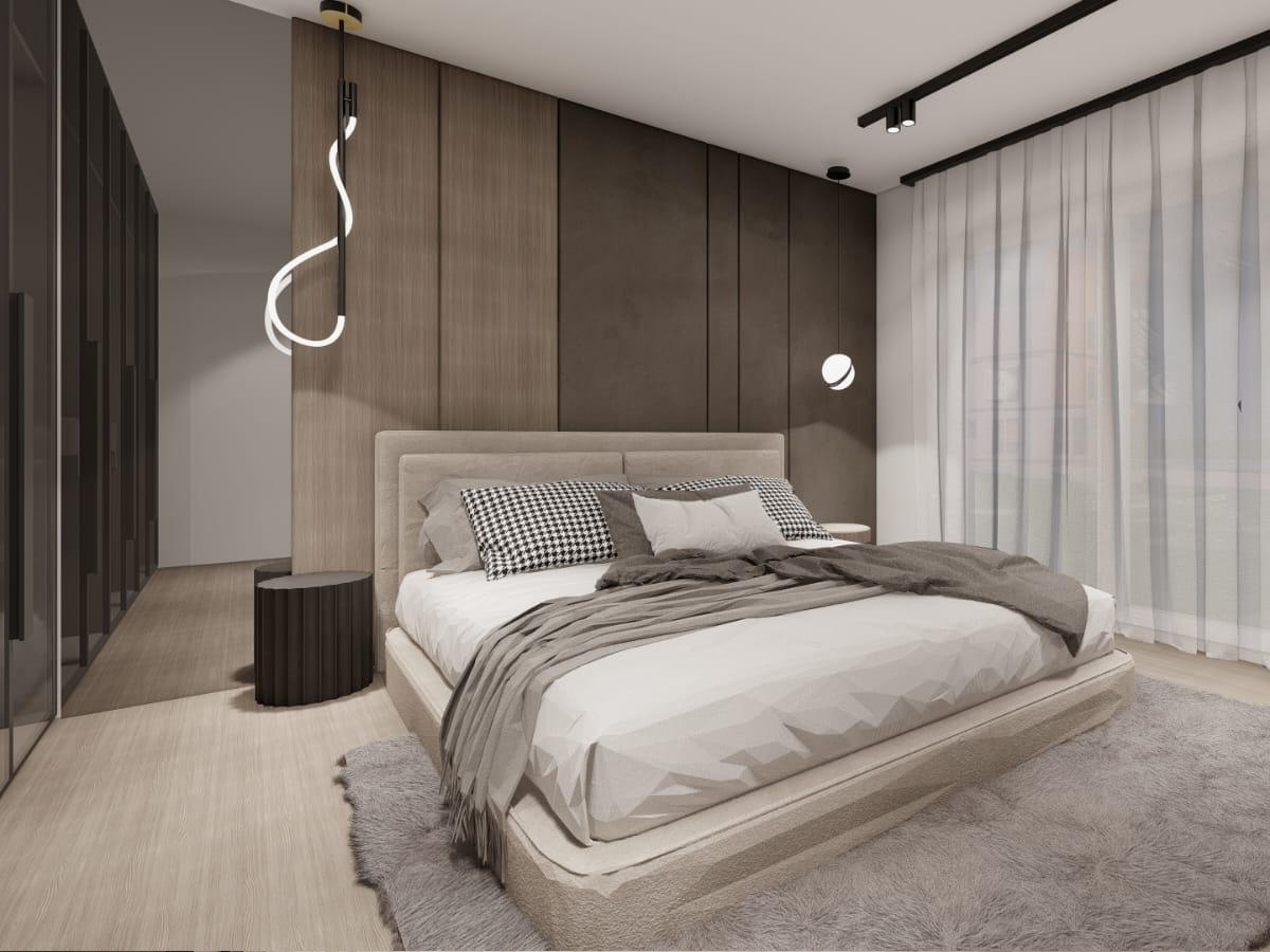 Geradeaus vom Flur liegt das Schlafzimmer. Durch seine ruhige Lage eignet es sich besonders gut als Rückzugsort. Der Raum bietet genügend Platz für ein Doppelbett und Schrankmöbel und wird über ein Fenster mit Tageslicht versorgt, wodurch eine helle und angenehme Atmosphäre entsteht.
