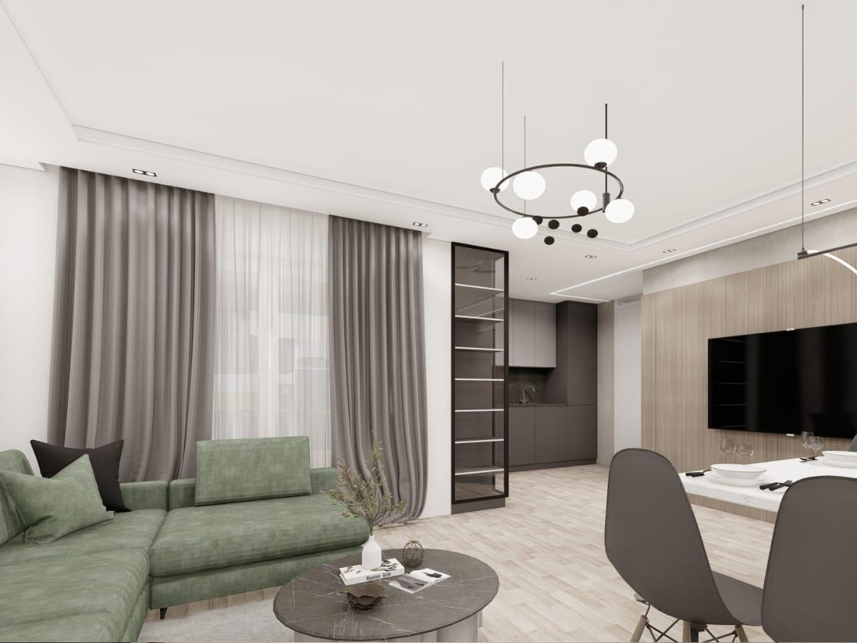 Ebenfalls vom Flur aus empfängt Sie der großzügige Wohnbereich mit offener Küche und Essbereich. Dieser Bereich bildet den Mittelpunkt der Wohnung und überzeugt durch seine klare Struktur und die gute Belichtung. Der Wohnraum bietet ausreichend Fläche für einen gemütlichen Sitzbereich, während der Essbereich sinnvoll an die Küche angebunden ist. Die offene Küche fügt sich harmonisch in den Raum ein und unterstützt ein modernes, offenes Wohngefühl.